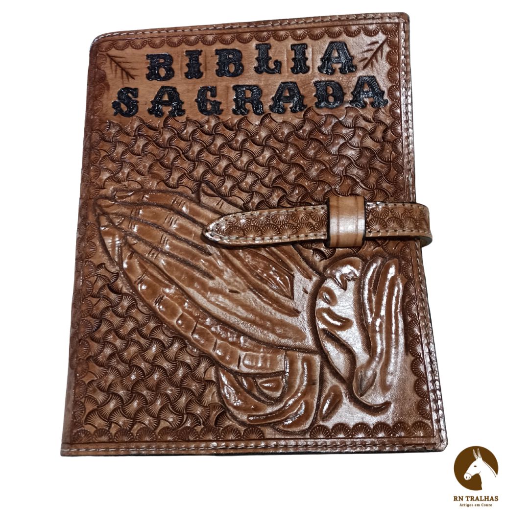 Capa para bíblia confecionada em couro, bordada, com costuras reforçadas e encaixe em couro para fechamento.