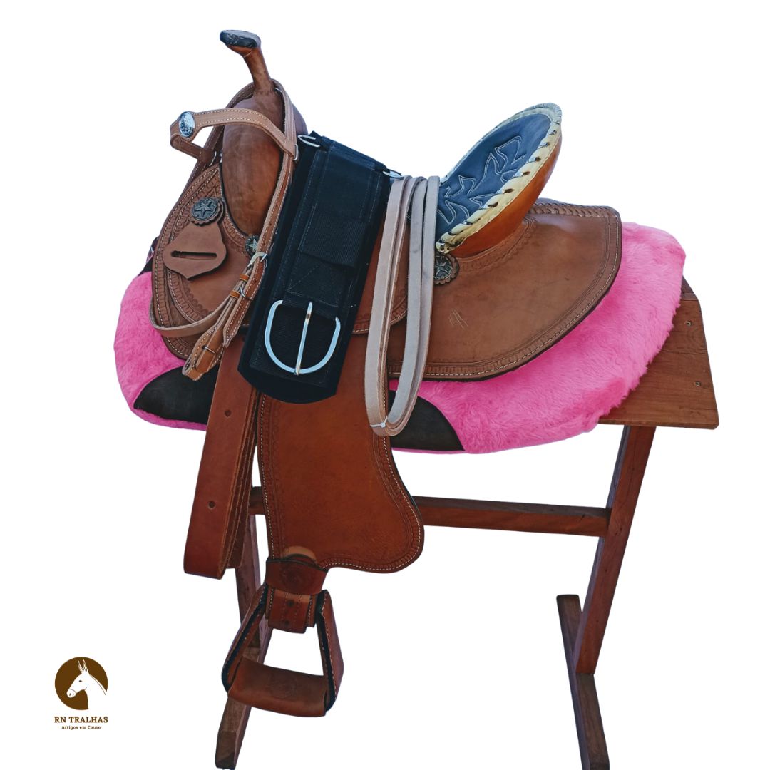 SELA RN TRALHAS TRÊS TAMBORES MEDINDO 13’ POLEGADAS É INDICADA PARA USO INFANTIL TODA FEITA A MÃO EM LEGÍTIMO COURO DE BÚFALO. POSSUI DETALHES EM REBAIXO ARTESANAL QUE DÃO BELEZA E PERFEITO ACABAMENTO A SELA POSSUI ARMAÇÃO DE MADEIRA RESISTENTE, ENERVADA EM COURO CRU. ACENTO EM NEOPREME CONFORTÁVEL E COM COM COSTURA REFORÇADA. A TRASEIRA É MODELO RANCHEIRA. TODAS AS FERRAGENS SÃO EM AÇO INOX (LIVRE DE FERRUGEM)